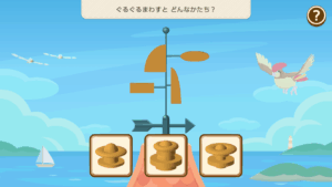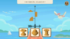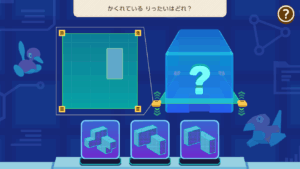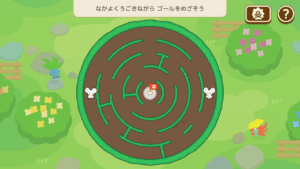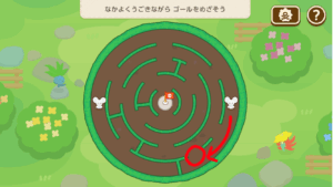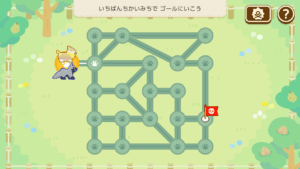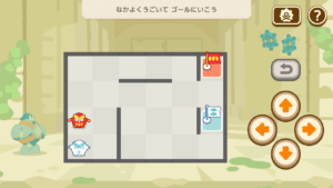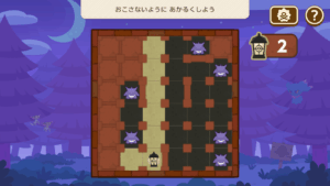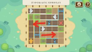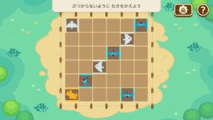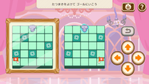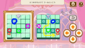 右の図形のニャスパーを動かしながらゴールを目指すゲーム。ぐるぐるマークに乗ると1歩戻される。左の鏡に動くニャスパーもぐるぐるマークに乗っても戻される。