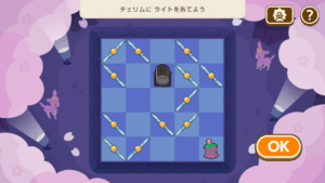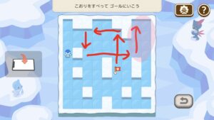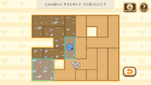 チラーミィが隣り合うパネルを通るとお片付けが済むので全てのパネルを通って最後にゴールのゴミ箱に辿り着くとクリア。