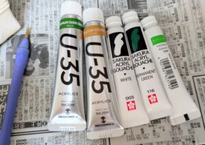 主に使った絵の具と筆。サクラのアクリルガッシュとターナーのアクリリックスを混ぜて使いました。どちらもアクリル絵の具です。