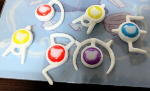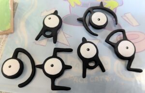 ポケカ立体化なので、主役のアンノーンも作りました。目玉の部分も粘土で作ろうかと思いましたが、地味に面倒なのでダイソーで使えそうなものを探しました。